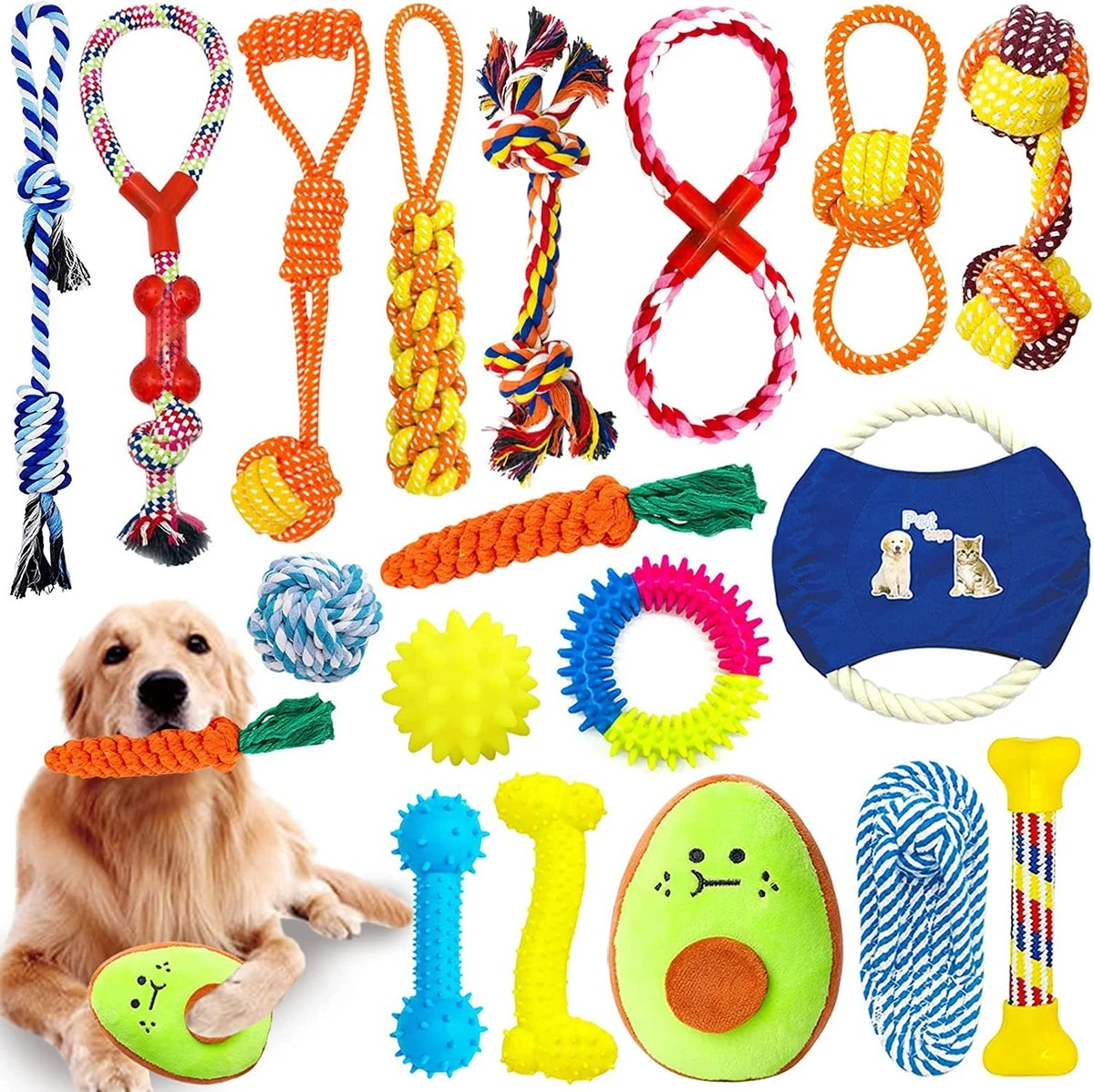 - 【18 stuks verschillend hondenspeelgoed】 Kauwtouwknoop,touwbal,vliegende schijven,halters,wortel,pantoffels,avocado-geluidsspeelgoed,deze puppy-touwbalsets kunnen gemakkelijk de interesse van honden wekken en eenzaamheid en verveling verminderen.
